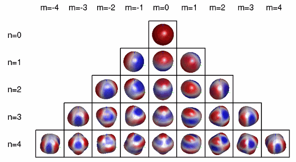 You can consider the vibrating bubbles below, e.g., as the sound particle velocity at a certain fixed radius r in the sound field. The spherical harmonics have two indices. n determines how many nodal circles the spherical harmonic modes have, and |m| counts how many of them run through north and south pole. Therefore it is clear that the spherical harmonics can be seen as the spatial resolution. Another nice property: they are orthogonal; e.g. only the first one has a non-zero mean value.