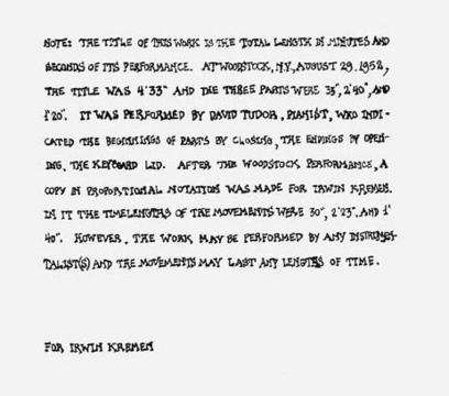 Note: The title of this work is the total length in minutes and seconds of its performance. At Woodstock, N.Y., August 29. 1952, the title was 4'33" and the three parts were 35", 2'40" and 1'20". It was performed by David Tudor, pianist, who indicated the beginning of parts by closing, the endings by opening the keyboard lid. After the Woodstock performance, a copy in proportional notation was made for Irwin Kremer. In it the timelengths of the movements were 30", 2'23" and 1'40". However, the work may be performed by any instrumentalist(s) and the movements may last any lenghts of time. For Irwin Kremer.