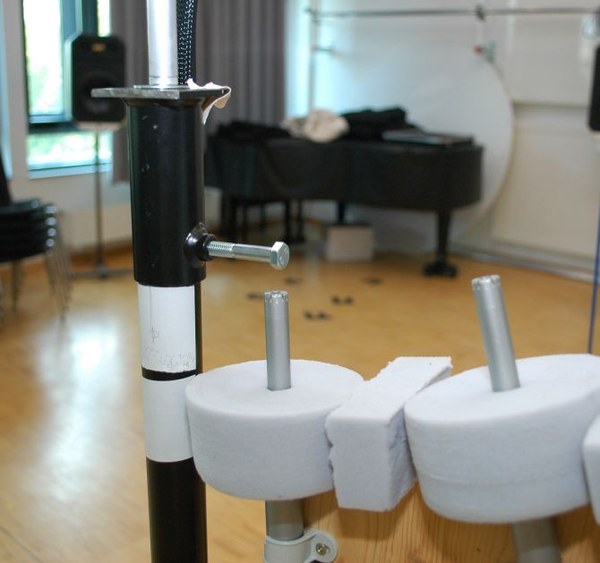 The arc was hanging from the ceiling by ropes, and its perpendicularity was adjusted by the use of a pendulum. A large circular plate was screwed to the turntable, and first this was positioned with a pendulum so that the pendulum was hitting the central whole (see bottom of Fig. 2.). This roughly centered the rotation axis. Then the speaker was mounted on this plate with its own stand, so that the stand could be freely moved on the plate. This additional degree of freedom helped to correct the errors coming of the non-verticality of the speaker stand, which would otherwise result in a circular motion of the speaker.